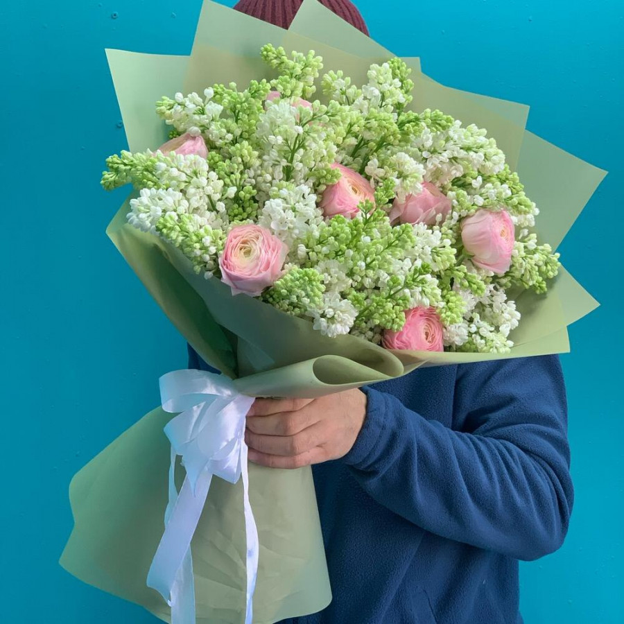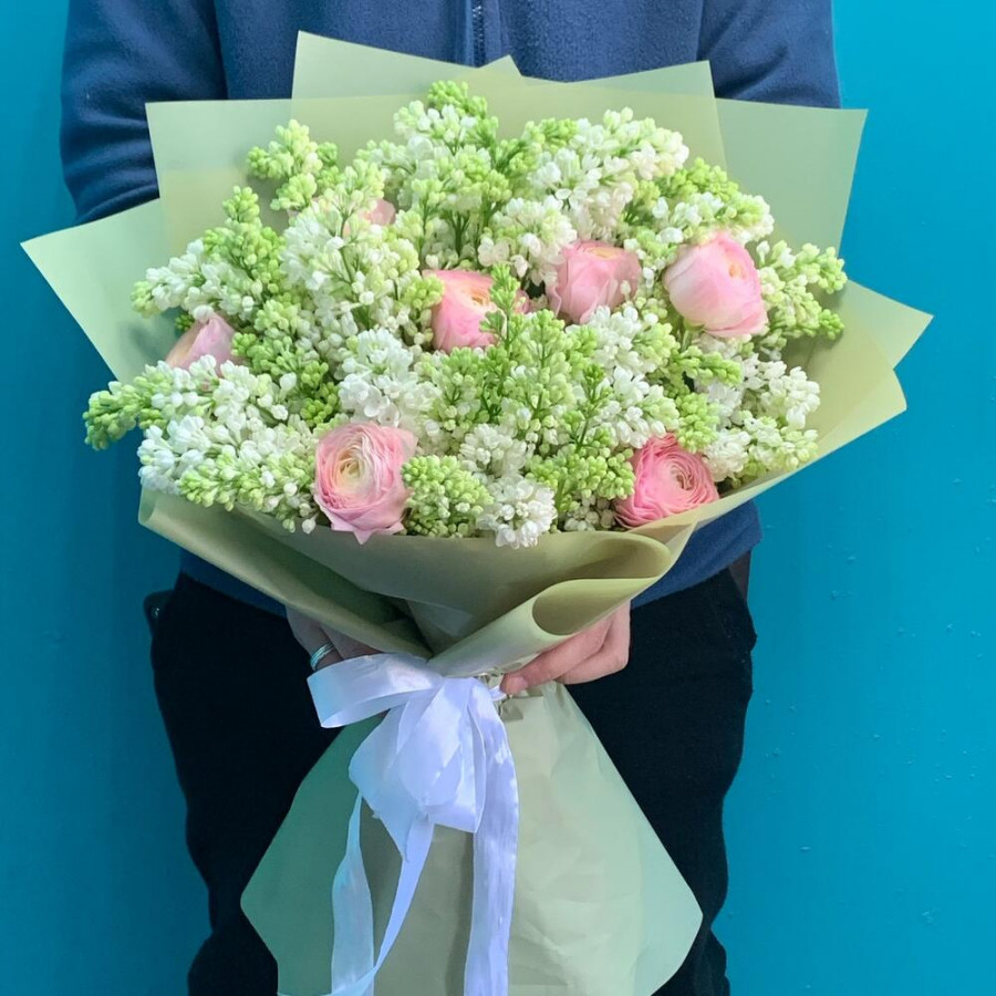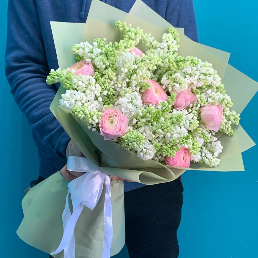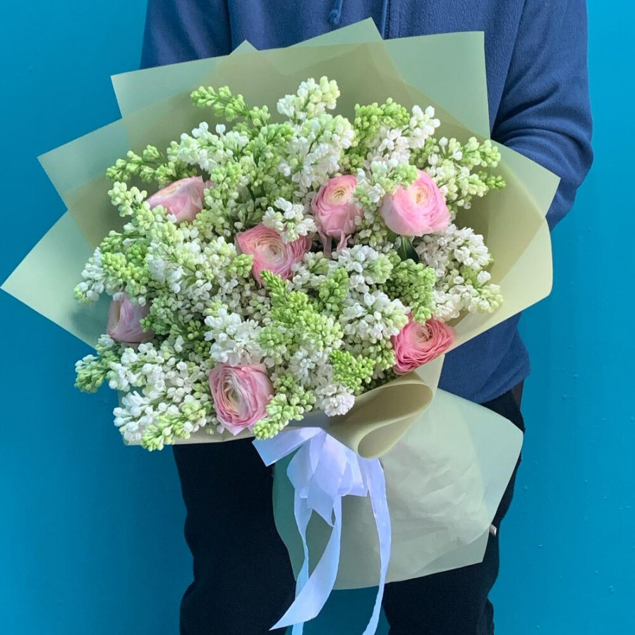 На фото букет из белой сирени и ранункулюсов. В составе: сирень 10 шт, ранункулюс 7 шт, дизайнерская упаковка 3 шт, атласная лента 2 шт, ferrero rocher 0 шт, . Все цветы свежие и ароматные, букет красиво оформлен и отлично подходит для подарка. Доступна доставка цветов или самовывоз.