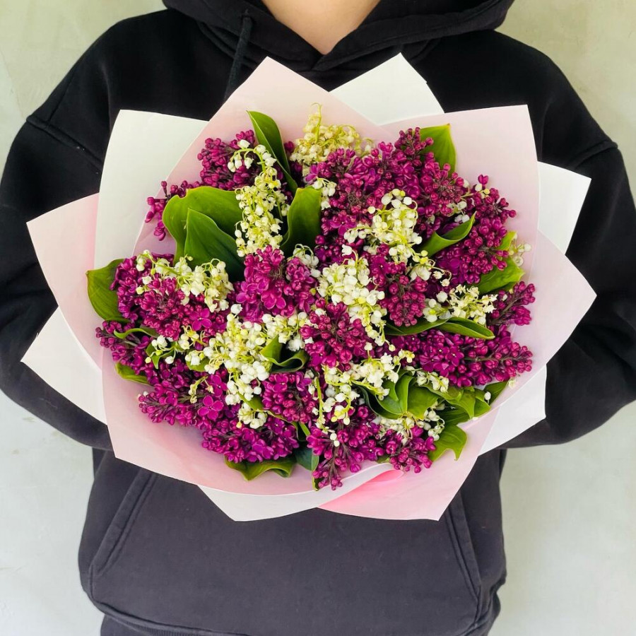 На фото букет из ландышей и сирени. В составе: сирень 7 шт, ландыш 5 шт, дизайнерская упаковка 1 шт, атласная лента 1 шт, . Все цветы свежие и ароматные, букет красиво оформлен и отлично подходит для подарка. Доступна доставка цветов или самовывоз.