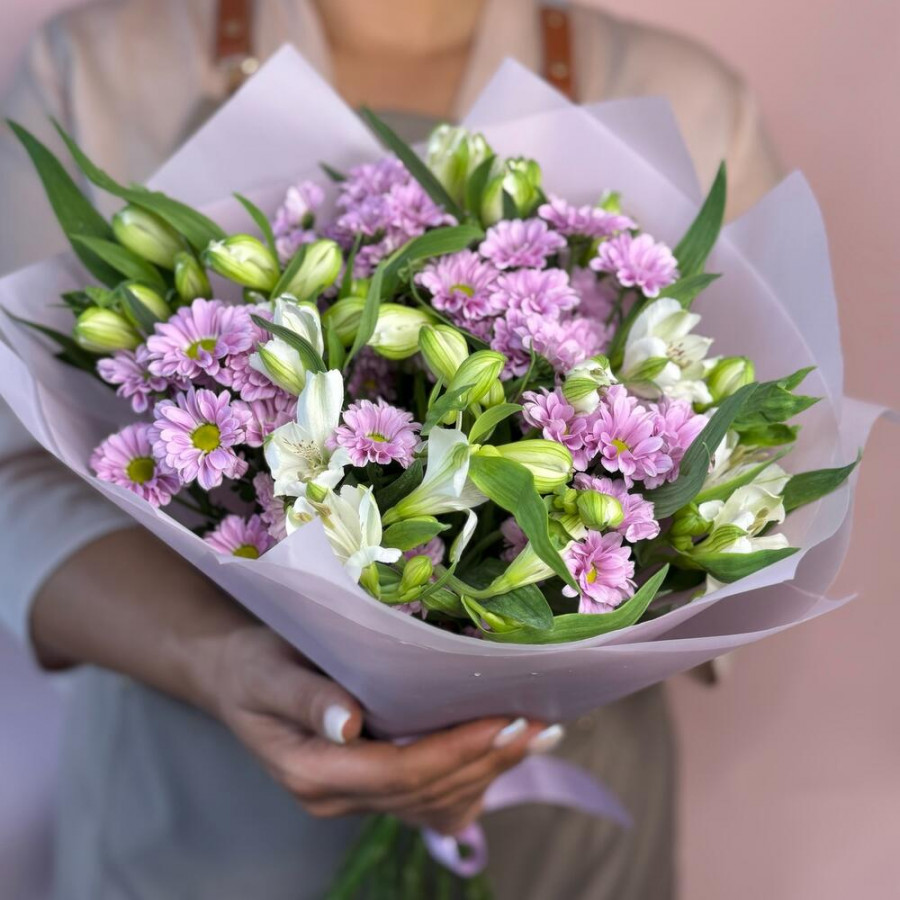 На фото букет «сиреневая соната». В составе: альстромерия 3 шт, хризантема кустовая 5 шт, дизайнерская упаковка 1 шт, атласная лента 1 шт, . Все цветы свежие и ароматные, букет красиво оформлен и отлично подходит для подарка. Доступна доставка цветов или самовывоз.
