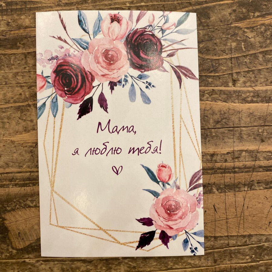 На фото открытка «мама, я люблю тебя!». В составе: . Все цветы свежие и ароматные, букет красиво оформлен и отлично подходит для подарка. Доступна доставка цветов или самовывоз.