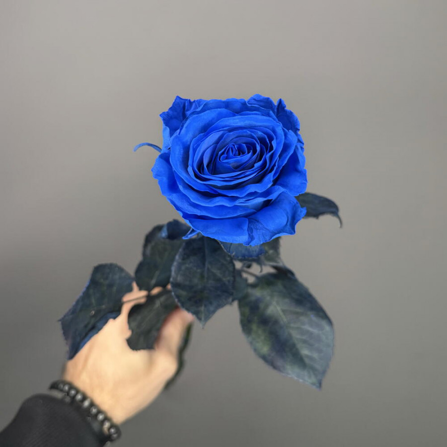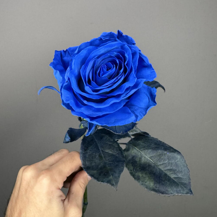 На фото синяя роза 1 штука. В составе: роза (синяя) 1 шт, . Все цветы свежие и ароматные, букет красиво оформлен и отлично подходит для подарка. Доступна доставка цветов или самовывоз.
